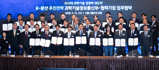 본격적인 전략 추진을 위해 과학기술정보통신부와 협력기업간 업무협약식이 11일 열렸고, 이 행사에는 배경훈 부총리 겸 과학기술정보통신부 장관을 비롯해 주요 정부출연연구기관 원장과 AI·인프라 및 8대 미션 관련 33곳 주요 기업 대표 등 50여 명이 참석했다. 이날 공식 출범한 ‘K-문샷 기업 파트너십’은 인공지능을 기반으로 과학기술 혁신을 촉진하고 국가적 난제 해결을 가속화하기 위한 민·관 협력 플랫폼으로, AI 인프라 기업 간 협력과 연계를 담당하는 중심적 역할을 수행한다.