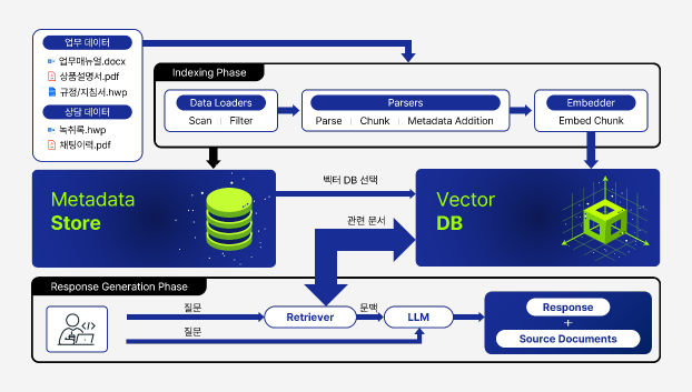 기업의 비즈니스 요구사항에 최적화된 Retrieval-Augmented Generation 아키텍처를 통해, 정적 smaller Language Model을 실시간 데이터 검색과 연계하여 Hallucination을 최소화하고, 신뢰도 높은 정보를 제공할 수 있습니다.이를 기반으로 기업의 다양한 업무 프로세스를 자동화 및 최적화함으로써, 기존의 정형화된 업무 방식을 혁신하고, 지능형 플랫폼 기반의 업무 효율성 극대화를 실현할 수 있습니다.