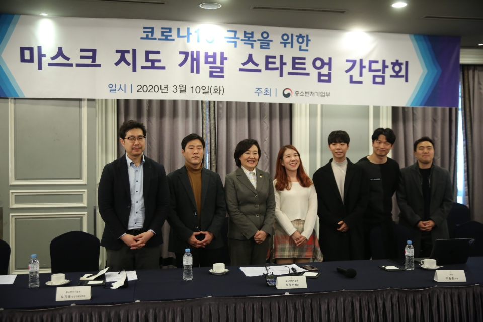 박영선 중소벤처기업부 장관은 10일 오후 여의도 켄싱턴호텔에서 스타트업 7개사 대표가 자리한 가운데 ‘코로나19 마스크지도 개발촉진을 위한 간담회’를 열었다. 이 자리에서 박 장관은 관련 스타트업 대표들로부터 코로나 마스크지도 개발 계획 및 건의사항을 들었다.
